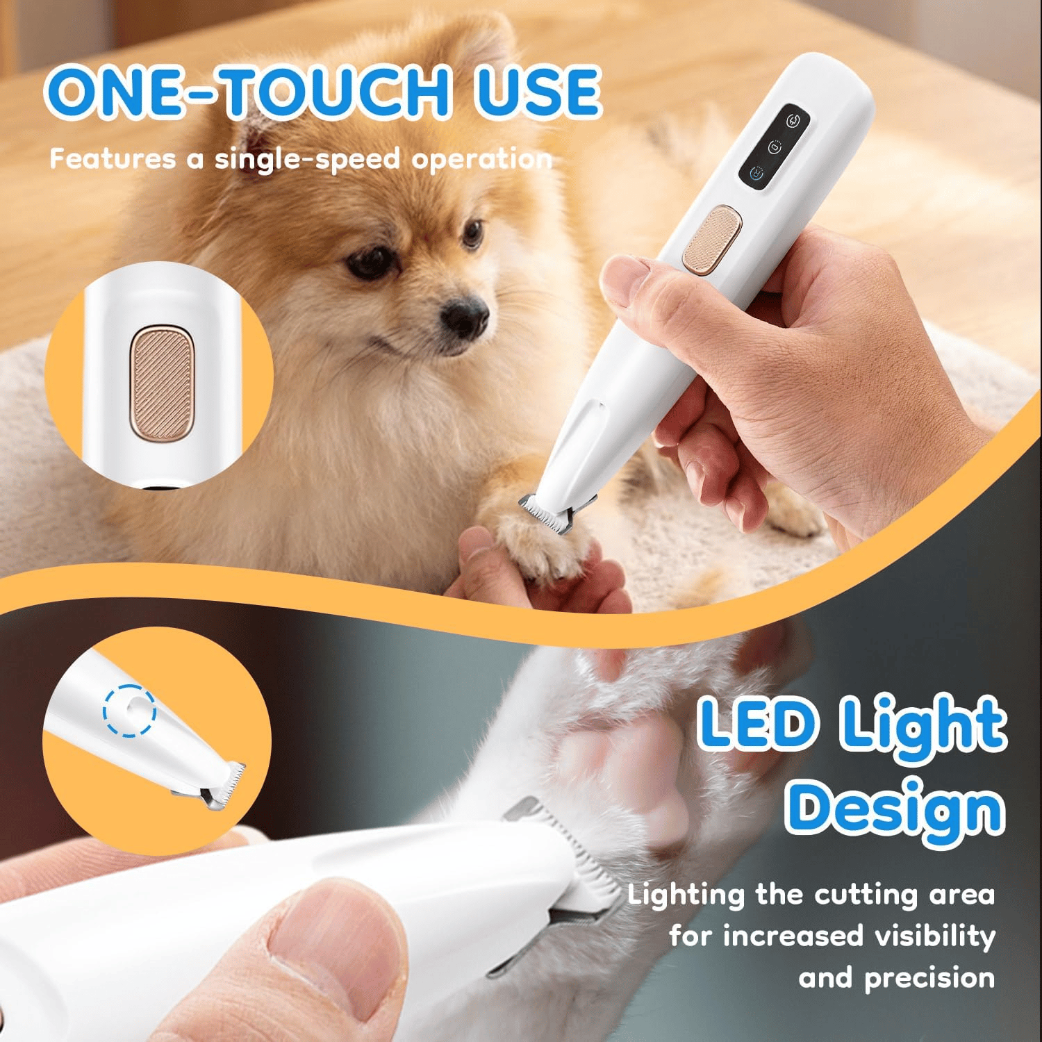 The stainless steel fixed blade provides excellent cutting performance, but the rounded edge ensures a smooth shave without scratching your pet. 0.7in Narrow Blade and LED Light - Designed for delicate areas like paws and ears.